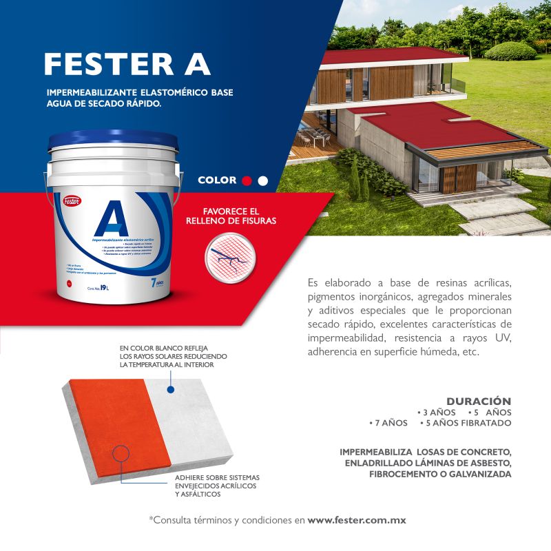 FESTER® A es un impermeabilizante elastomérico que debido a su tecnología de rápido secado, permite hacer la impermeabilización completa en un solo día. Es elaborado a base de resinas acrílicas, pigmentos inorgánicos, agregados minerales y aditivos especiales que le proporcionan secado rápido, excelentes características de impermeabilidad, resistencia a rayos UV, adherencia en superficie húmeda, etc.